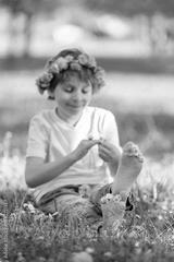 Portrait of cute stylish smiling toddler boy sitting in the grass in park