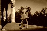 Beautiful, shapely woman in elegant luxury evening dress sensually walks around the city on a sunny summer day. Luxury summer fashion