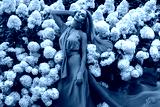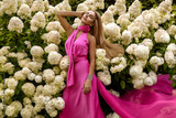 Elegant woman in flowing pink dress walking sensually through lush flower garden on sunny summer day. Summer fashion.