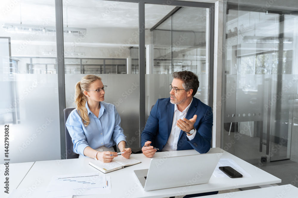 Mature mentor senior leader man, young woman manager discussing project on laptop in modern office. Two partners, colleagues, team of professional finance specialist business people working together