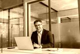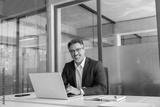 Smiling portrait senior businessman professional entrepreneur working at desk on financial work, looking at camera. Mature Latin business man ceo manager using laptop computer in office. Copy space