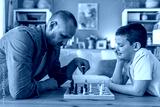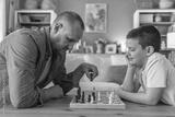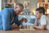 A Caucasian father and son sit in a bright room, deeply focused on a chess game. Young father and cute boy engaged in thoughtful chess game.