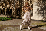 Elegant woman in tulle beige long skirt and fashionable sequin top posing in the city in summer sunlight. Summer urban fashion.