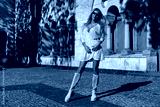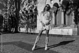 Elegant female model in silver sequin mini dress and fashionable boots posing in the city in summer sunlight. Summer urban fashion.