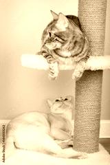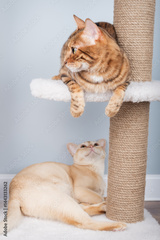 Two pedigree cats on a scratching post in the living room