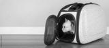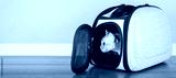 Burmese cat in a soft carrier indoors.