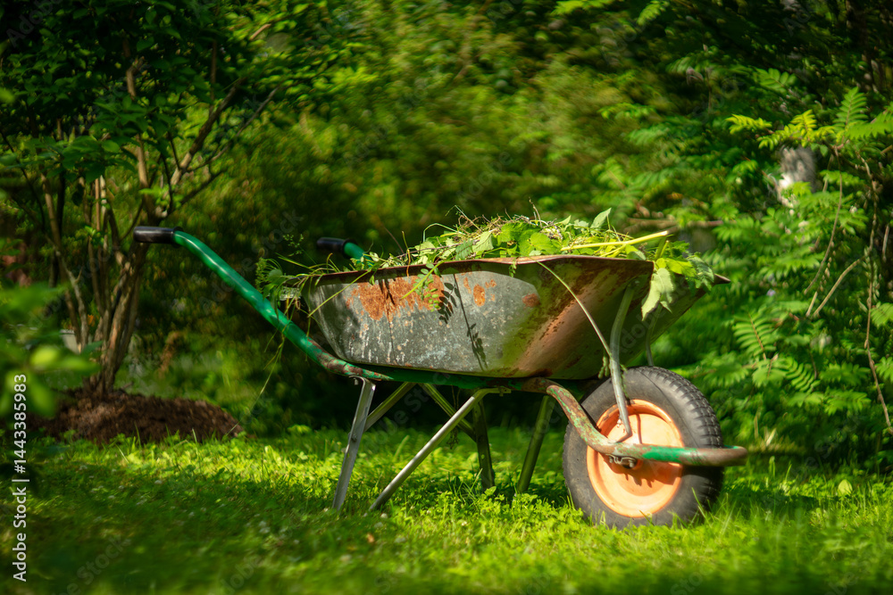 A wheelbarrow for a vegetable garden with green grass.To collect the mown grass in the garden.