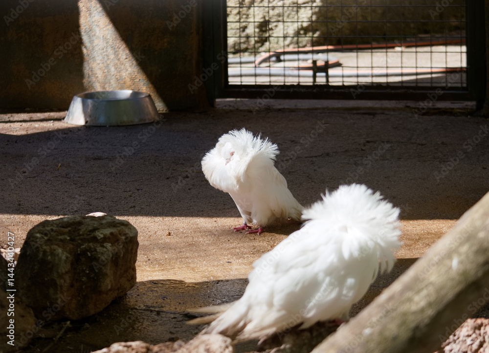 Two white birds with fluffy feathers explore their enclosure in a zoo during a sunny afternoon