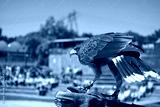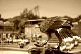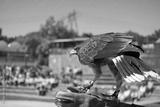 Majestic bird of prey perched on handler's glove at outdoor falconry event during sunny day