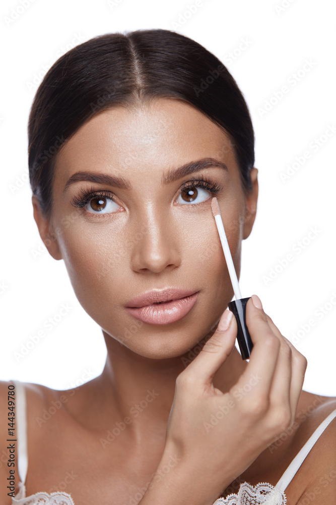 Beautiful Woman Applying Corrector On Beauty Face. Makeup
