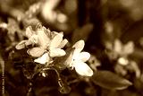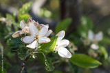 Damaged apple tree blossoms in spring sunlight after frost exposure. Concept of fragile ecosystems and seasonal weather extremes
