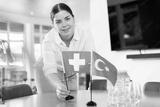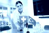 Positive young woman putting little flag of Switzerland on the table with flag of Turkey in conference room for international negotiations