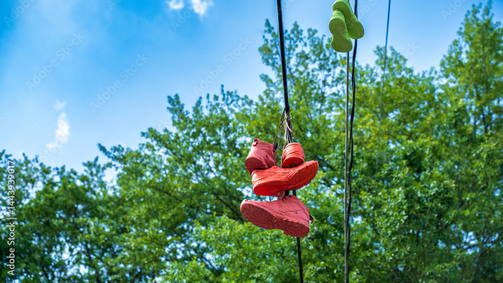 Painted pair of shoes hanging on wire or cable wire. A kind of art display to attract passengers. A creative ways to advertise a location like bar or pub for people to hang out