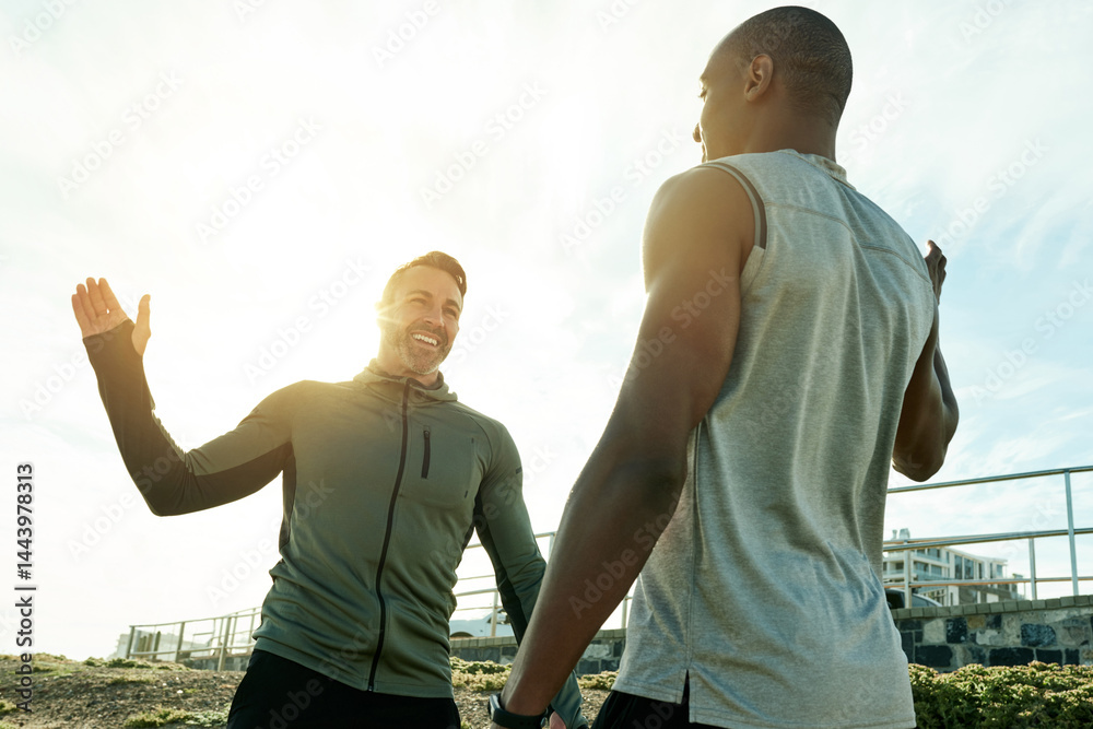High five, men and celebration for friends, fitness and personal trainer with motivation for client. Outdoor, athlete and people with smile for accomplishment, thank you and success for workout
