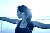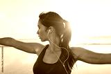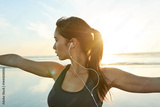 Nature, yoga and woman in warrior pose for posture, wellness or holistic health for calm soul. Relax, beach or zen female person stretching arms for mindfulness, chakra balance or peace for awareness
