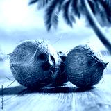 Whole coconuts on a wooden table with tropical beach and coconut palm trees in the background on a hot summer day.