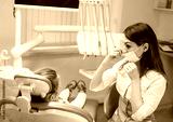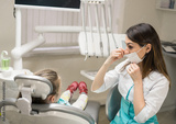 Dentist woman preparing talking to little girl patient and preparing for treatment at dental clinic.