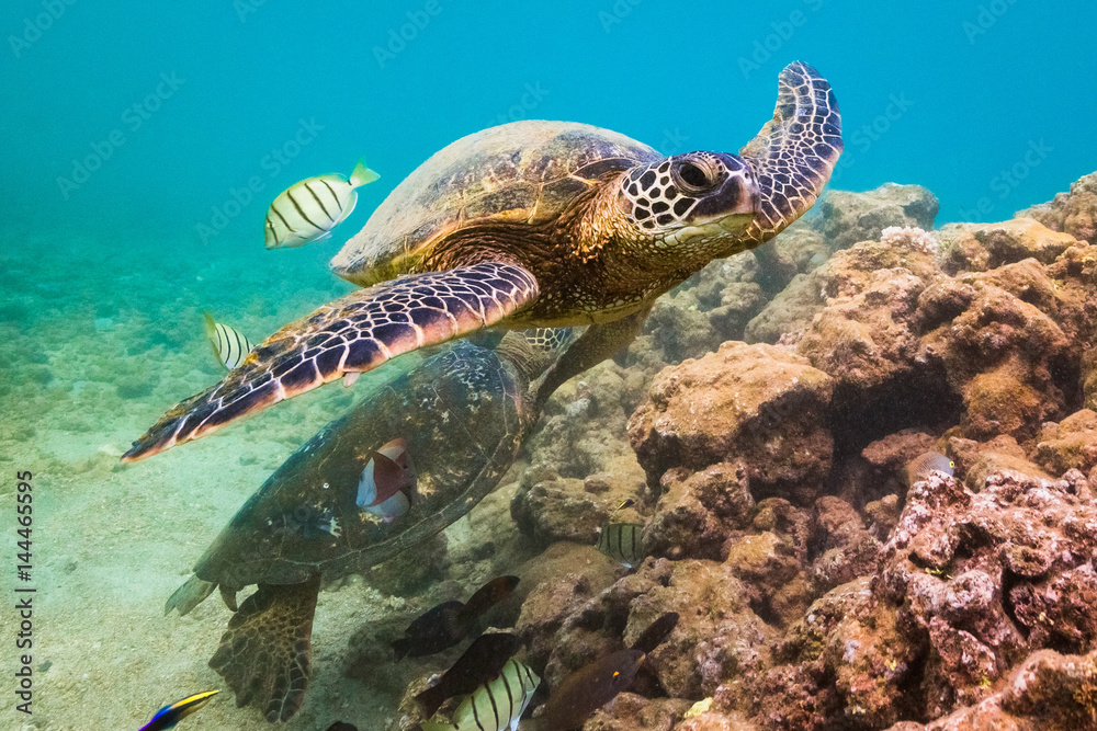 Endangered Hawaiian Green Sea Turtle Cruising in the warm waters of the Pacific Ocean