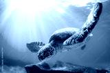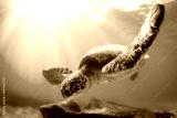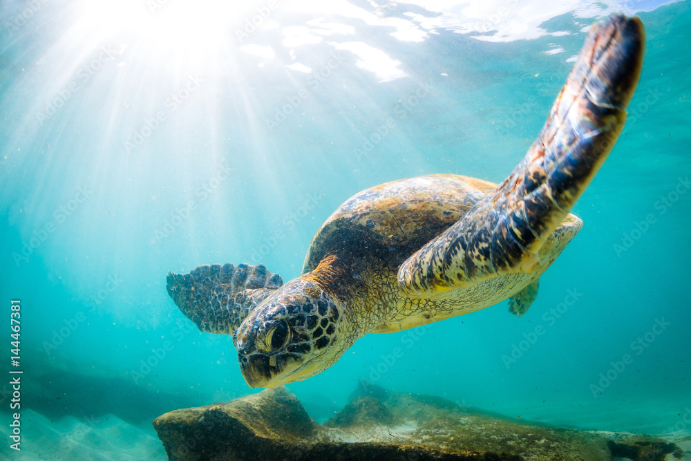 Endangered Hawaiian Green Sea Turtle Cruising in the warm waters of the Pacific Ocean