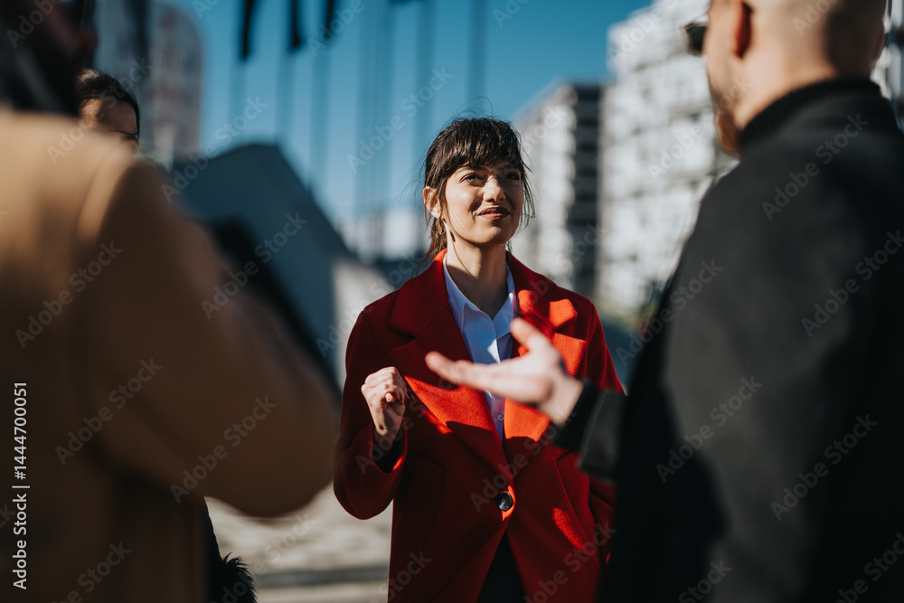 Business people engaging in discussion outdoors, wearing formal clothing, symbolizing teamwork and collaboration.
