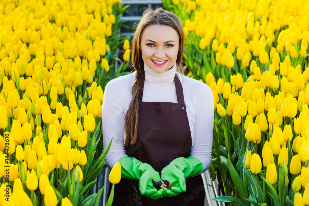 Woman gardener dressed in a working uniform holding tulip bulb, smiling looking at the camera, while standing in greenhouse with yellow tulips . Industrial cultivation of flowers, Hydroponics.
