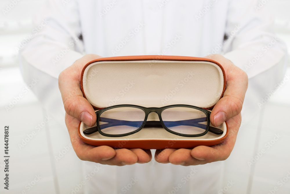 Optometrist hands holding new eyeglasses, at optician shop. Eyesight correction concept, top view