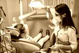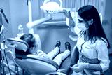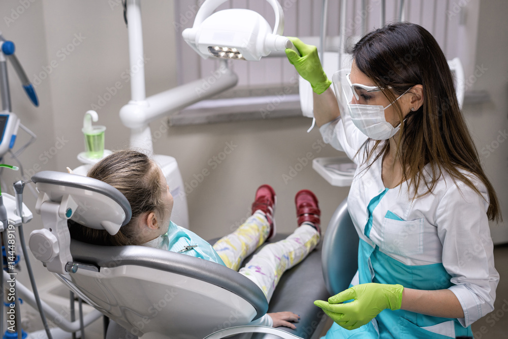 Dentist woman preparing light for treatment at dental clinic. She has little girl patient.