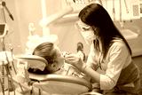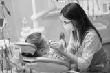 Female Dentist checking little cute girl patient at dental clinic. She is inspecting her mouth.