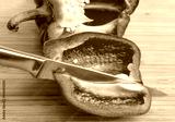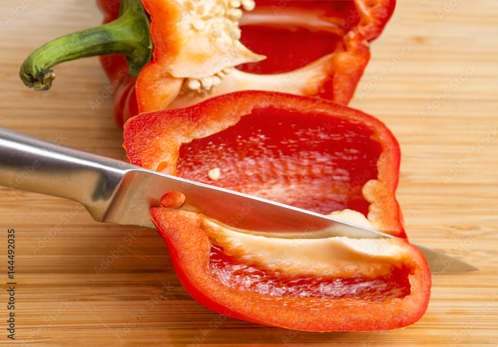 Sharp knife cutting fresh red bell pepper into quarters, closeup on wooden cutting board