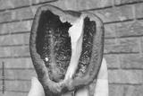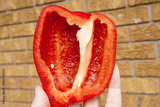 Hand holding up half a fresh raw sweet red bell pepper, defocused brick background