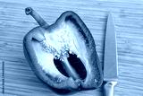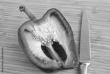 Half of red bell pepper freshly sliced and sharp knife lying on wooden cutting board, nutrition concept