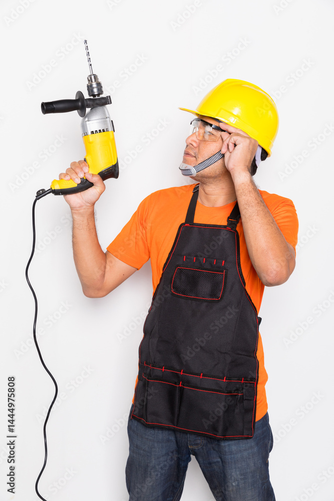 Portrait worker in black uniform with electric drill isolated on white background