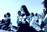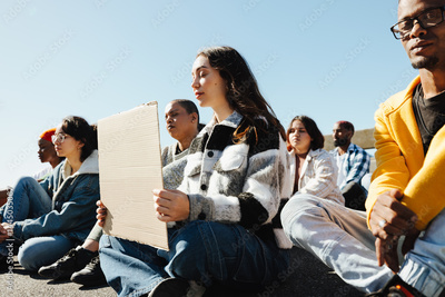 Group of protestors seated outdoors holding signs on a bright sunny day