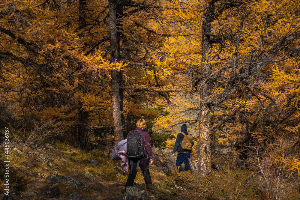 Hikers explore a picturesque autumn forest with brilliant golden foliage under clear sunlight.