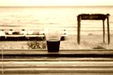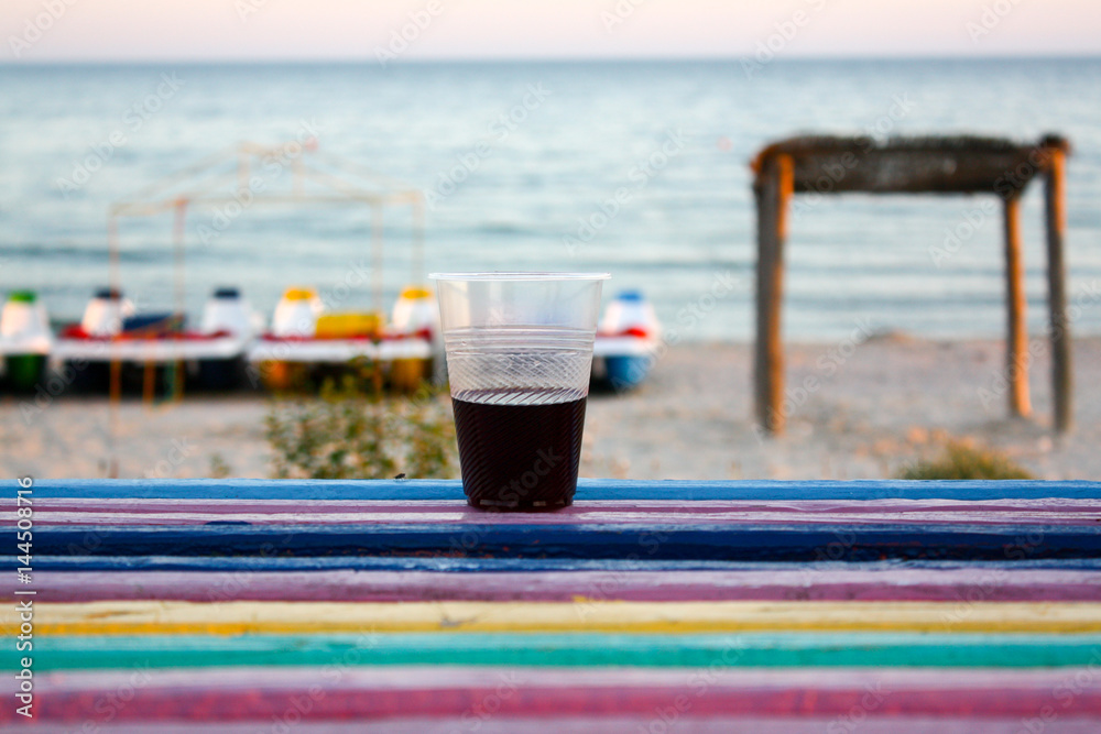 A plastic glassof wine stands on the colored bench, the sea and the catamarans in the background