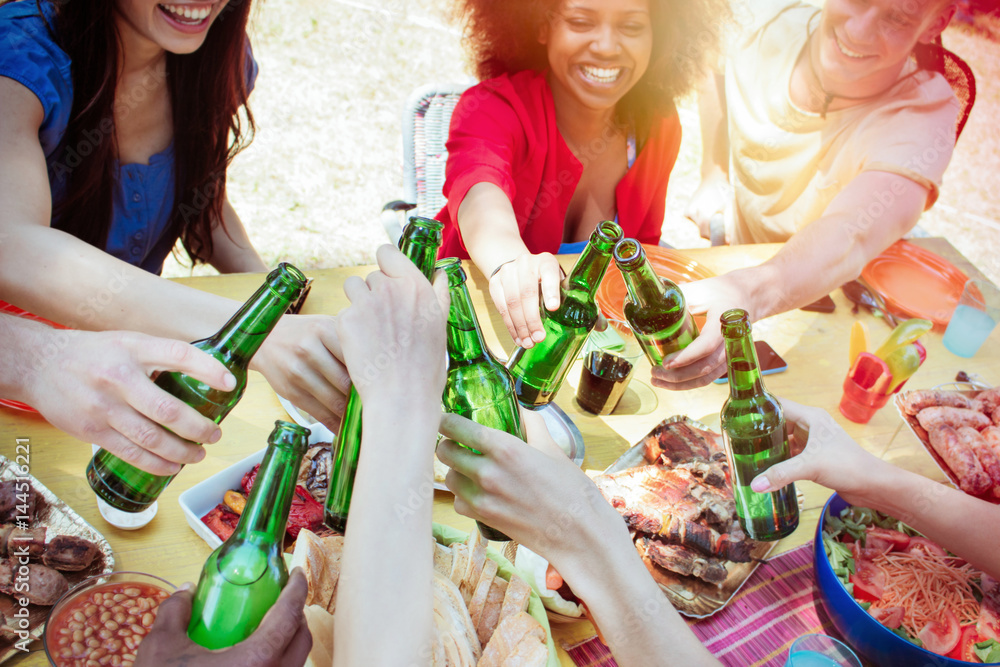 group of diverse people at garden lunch table toasting cheers with bottles of beer. custom colors and sunshine effects.. concept of multi-racial friendship youth togetherness and people having fun