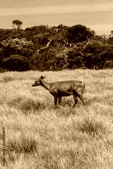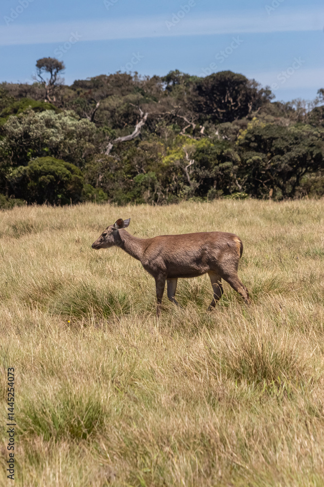 Sambar Deer Grazing in Dry Grassland Near Forest Edge