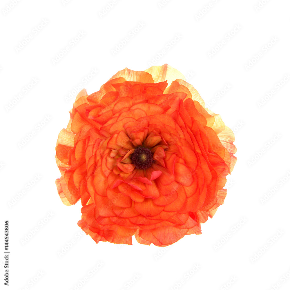 One Bright orange Ranunculus asiaticus flower, isolated on white background.