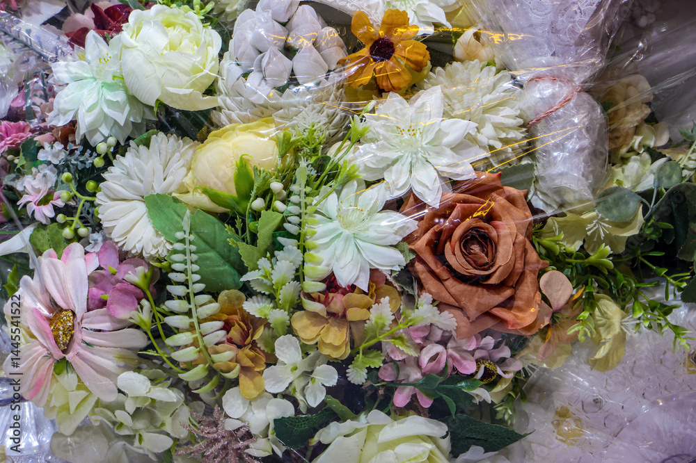 Artificial flowers for decoration inside a plastic sack