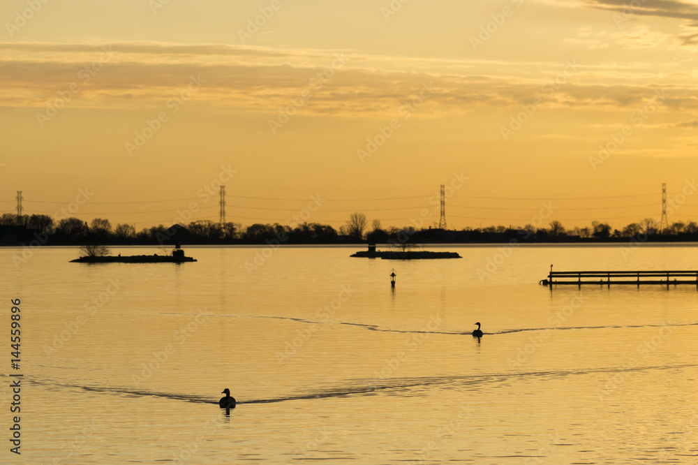 Golden sunrise tranquil scene of two birds drifting calmly on a golden lake reflecting the morning color