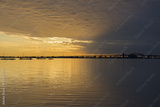 Beautiful sunrise and stormy sky over tranquil lake waters, bridge in silhouette