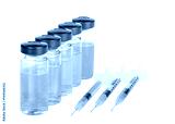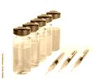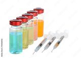 Five Vials of medication exaggerated psychedelic with bright color of fluid. Three syringes with drugs and a drop of fluid at the needle tip. Isolated on white background.