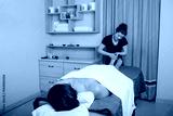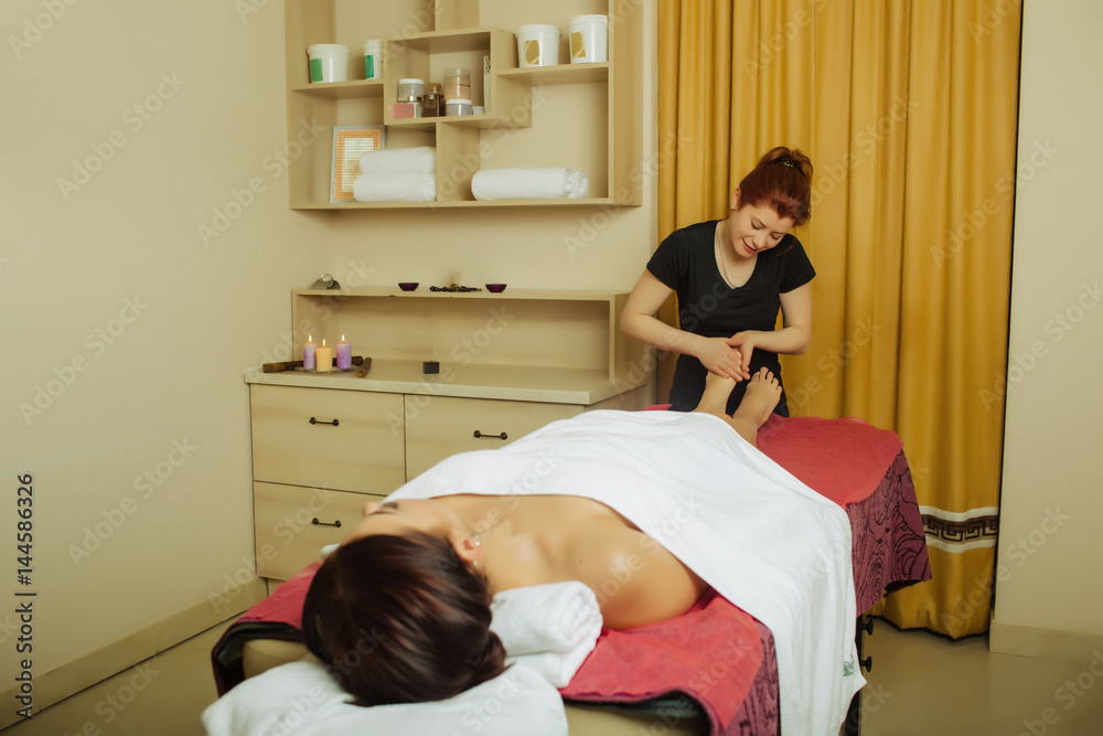 attractive massage therapist, woman doing relaxing feet massage , in a spa center. Wellness legs massage