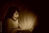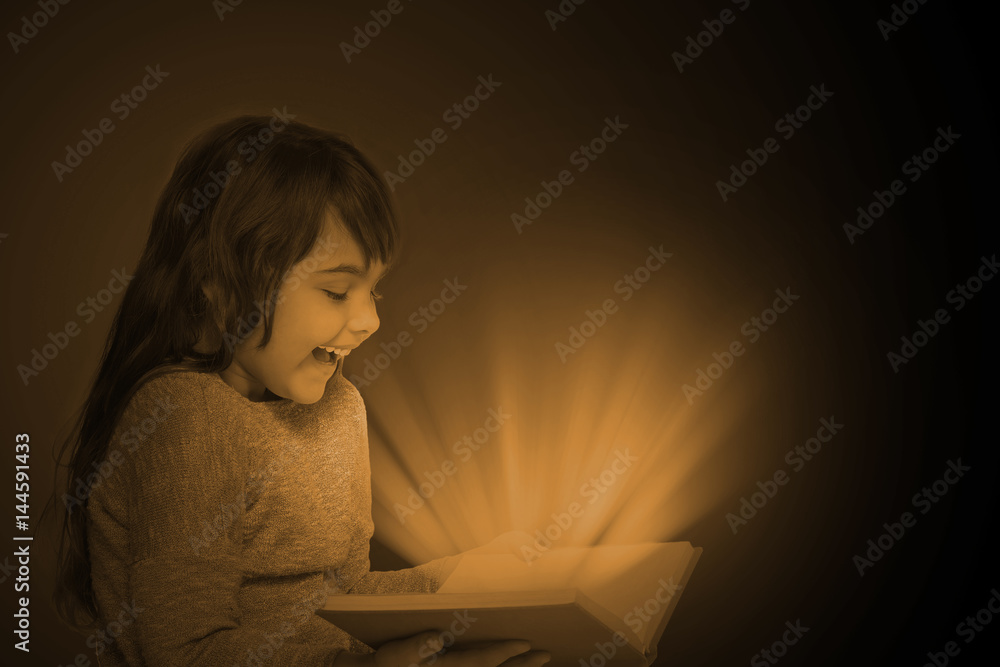 Vintage dark photo of smiling long haired little girl holding open book in her hands. From the book emerge dark yellow rays that dazzle the gir`s face. All is on the dark background.