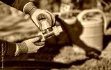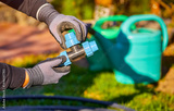 Closeup of hands in the gloves. Process of installing fittings pipes and connectors for the garden and lawn irrigation system installation. Green grass, shallow depth of field.