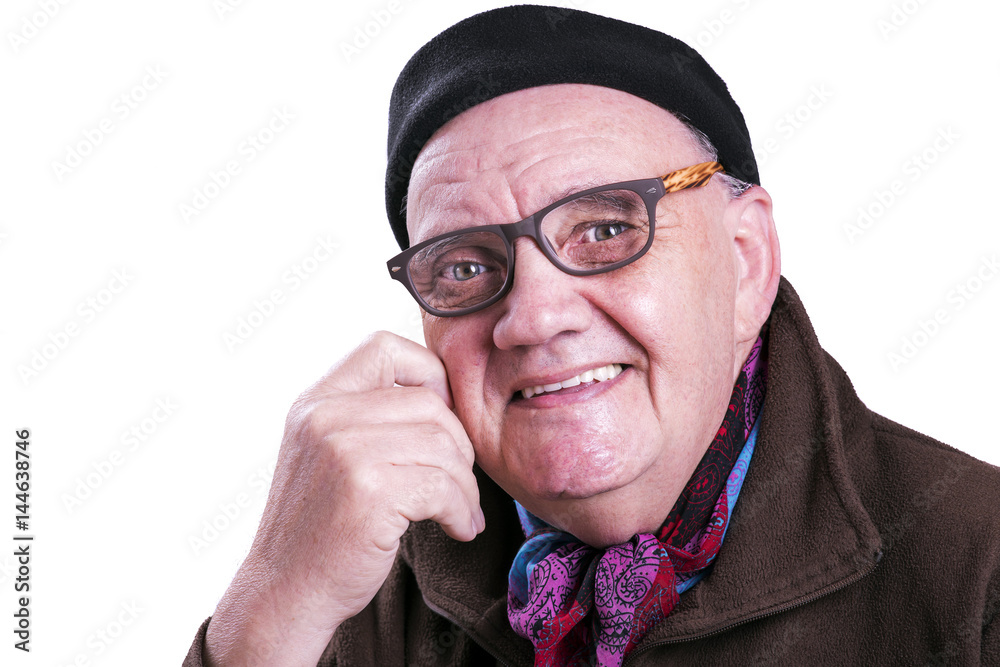 portrait homme âgé avec lunettes et casquette souriant sur fond blanc