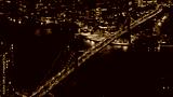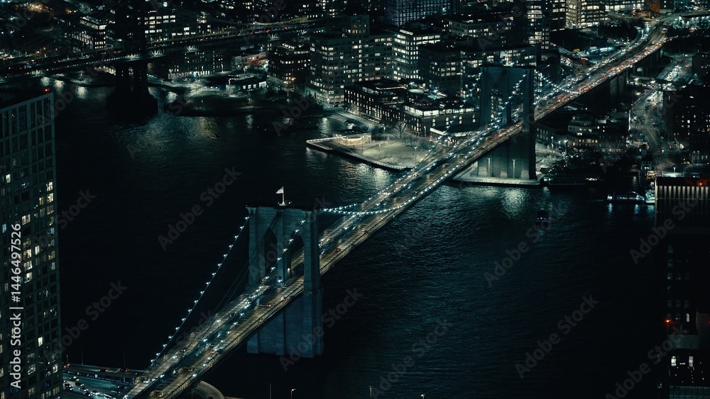 Aerial view of car traffic on Brooklyn Bridge at night, connecting Manhattan and Brooklyn in New York City