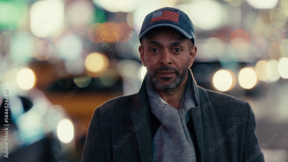 Portrait of businessman wearing american flag baseball cap in Times Square, Manhattan, New York City, United States of America