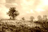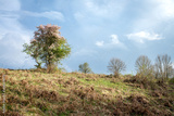 un pommier rose sur le haut d'une colline