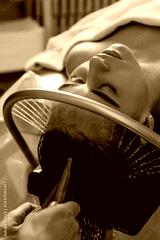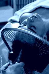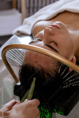 Close-up of a woman receiving a relaxing Japanese head spa treatment, with green massage sticks applied to her scalp, while water gently flows from a special tool during the session in a beauty salon